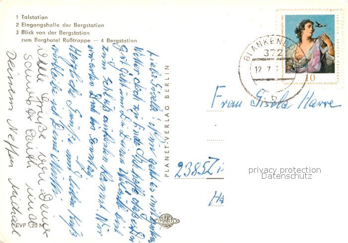 73066712 alte Postkarte Thale Harz Personenschwebebahn Talstation Eingangshalle der Bergstation Berghotel Rosstrappe postalisch gelaufen Erhaltung siehe scans [WerneD78] KatCode: 11110015085330