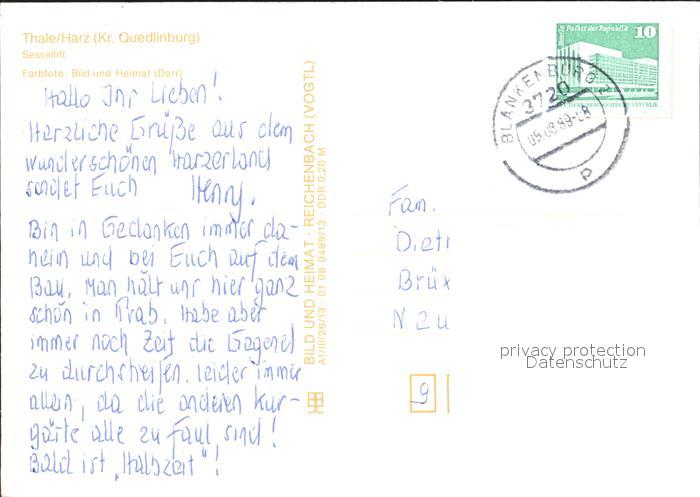 72382881 alte Postkarte Thale Harz Sessellift postalisch gelaufen Erhaltung siehe scans KatCode: 11110015085330