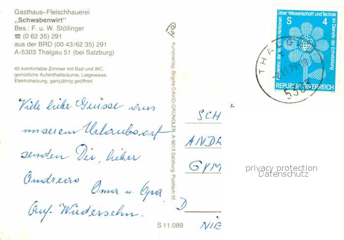 12603945 alte Postkarte Thalgau Gasthaus Fleischhauereri Schwabenwirt postalisch gelaufen Erhaltung siehe scans [LiesaD40] KatCode: 11390323050337