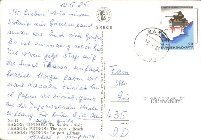 old postcard Thasos Le port Plage Faehre postalisch gelaufen Erhaltung siehe scans