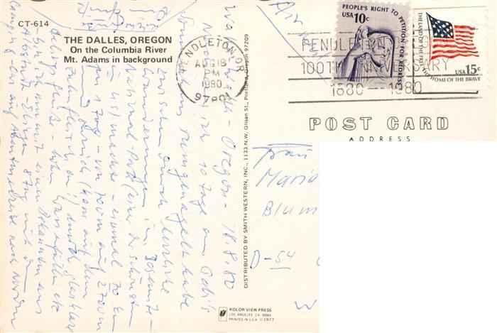old postcard The Dalles Oregon USA Panorama Columbia River Mount Adams aerial view postalisch gelaufen Fliegeraufnahme Erhaltung siehe scans [FriedD77]