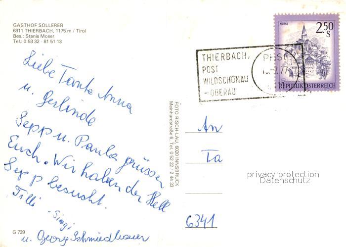 12932567 alte Postkarte Thierbach Wildschoenau Gasthof Sollerer postalisch gelaufen Erhaltung siehe scans [NatalD47] KatCode: 11390335070530