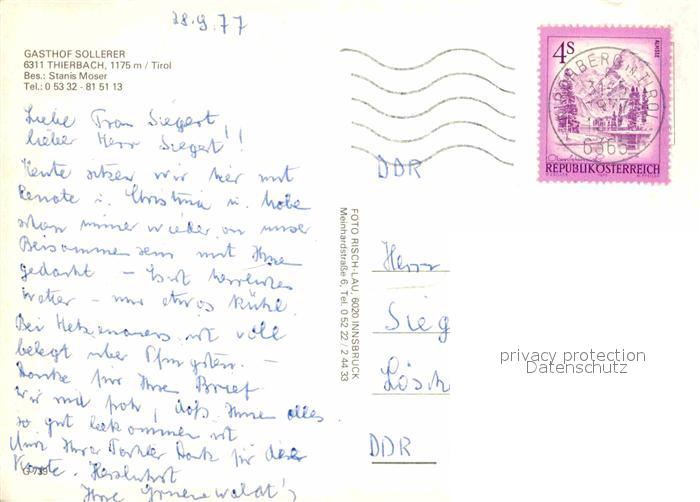 72631542 alte Postkarte Thierbach Wildschoenau Gasthof Sollerer postalisch gelaufen Erhaltung siehe scans [LiesaD40] KatCode: 11390335070530