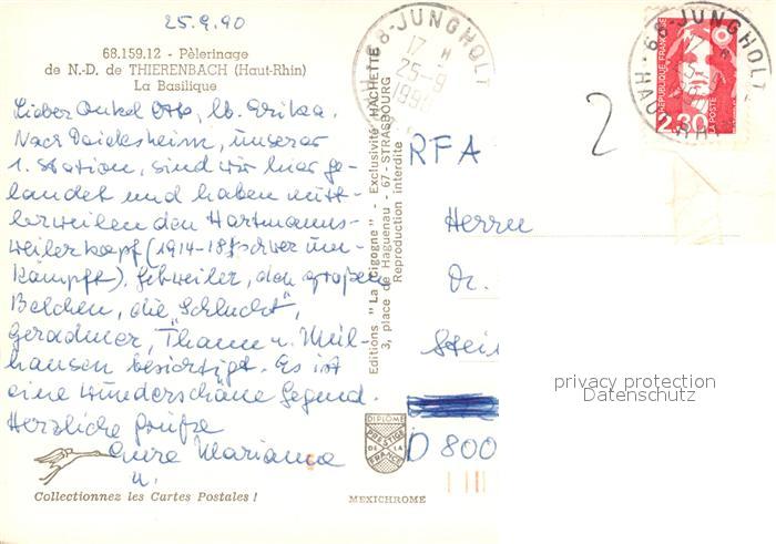 13234347 carte postale Thierenbach Haut Rhin Elsass Pèlerinage La Basilique Wallfahrtsort Fliegeraufnahme postalisch gelaufen Erhaltung siehe scans [FriedD77] KatCode: 11170068368159