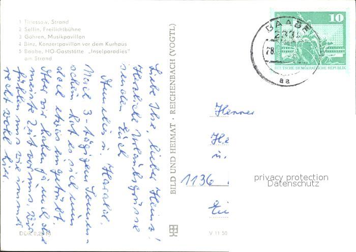 72344299 alte Postkarte Thiessow Ostseebad Ruegen Strand Sellin Freilichtbuehne Goehren Musikpavillon Binz Konzertpavillon Kurhaus Baabe HO Gaststaette postalisch gelaufen Erhaltung siehe scans KatCode: 11110013061040