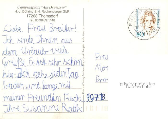 73209386 alte Postkarte Thomsdorf Boitzenburger Land Campingplatz Am Dreetzsee Feldberger Seenlandschaft Fliegeraufnahme postalisch gelaufen Erhaltung siehe scans [FriedD77] KatCode: 11110012073069