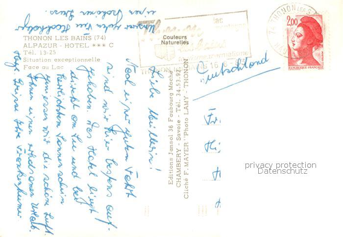 13721377 Thonon-les-Bains Alpazur Hotel Bar Foyer Jardin Chambre postalisch gelaufen Erhaltung siehe scans [FriedD77] carte postale Frie Katcode 11170074474281