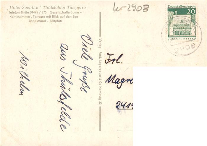 73914350 alte Postkarte Thuelsfelder Talsperre Cloppenburg Hotel Seeblick Terrasse Gastraum Duenen postalisch gelaufen Erhaltung siehe scans [FriedD77] KatCode: 11110003453004
