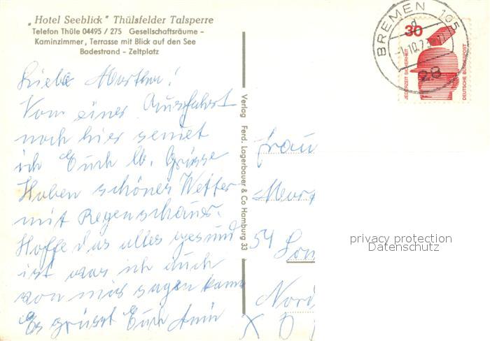 73633518 alte Postkarte Thuelsfelder Talsperre Gesellschaftsraeume Kaminzimmer Terrasse mit Seeblick Badestrand Zeltplatz postalisch gelaufen Erhaltung siehe scans [WerneD78] KatCode: 11110003453004