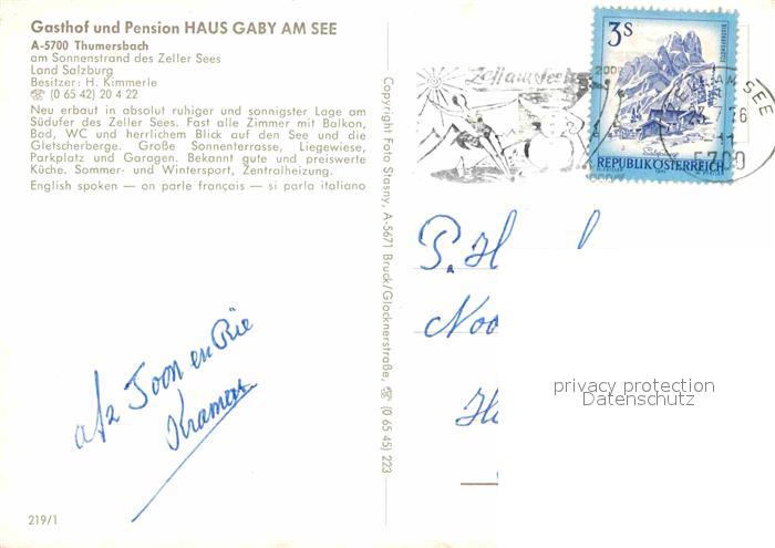 72898133 alte Postkarte Thumersbach Gasthof Pension Haus Gaby am See postalisch gelaufen Erhaltung siehe scans [FriedD77] KatCode: 11390322050628