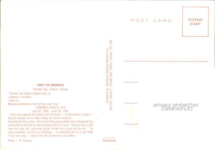Thunder Bay Terry Fox Memorial postalisch nicht gelaufen Erhaltung siehe scans