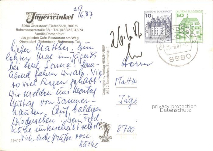 72257023 alte Postkarte Tiefenbach Oberstdorf Alpengasthof Cafe Jaegerwinkel postalisch gelaufen Erhaltung siehe scans KatCode: 11110009780133