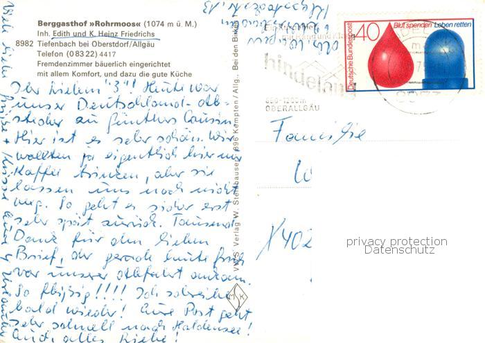 73866425 alte Postkarte Tiefenbach Oberstdorf Berggasthof Rohrmoos Allgaeuer Alpen postalisch gelaufen Erhaltung siehe scans [FriedD77] KatCode: 11110009780133