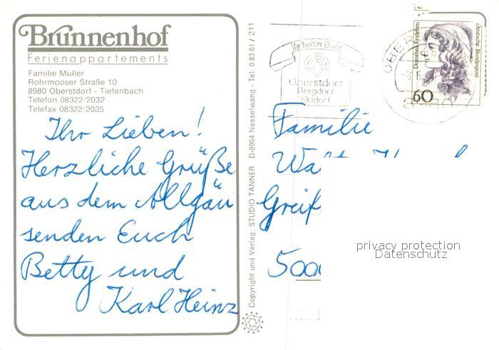 73726318 alte Postkarte Tiefenbach Oberstdorf Brunnenhof Ferienappartements Restaurant Fitness-Studio Hallenbad postalisch gelaufen Erhaltung siehe scans [FriedD77] KatCode: 11110009780133