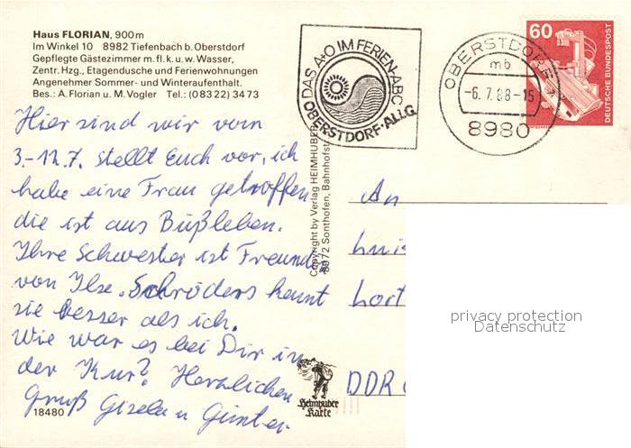 73165023 alte Postkarte Tiefenbach Oberstdorf Haus Florian Panorama Gastraum postalisch gelaufen Erhaltung siehe scans [WerneD78] KatCode: 11110009780133