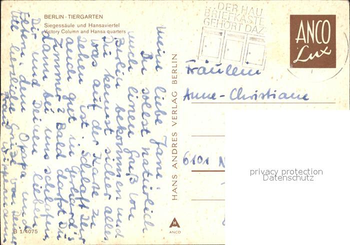 72583095 alte Postkarte Tiergarten Berlin Siegessaeule Hansaviertel Fliegeraufnahme postalisch gelaufen Erhaltung siehe scans [FriedD77] KatCode: 11110011000000