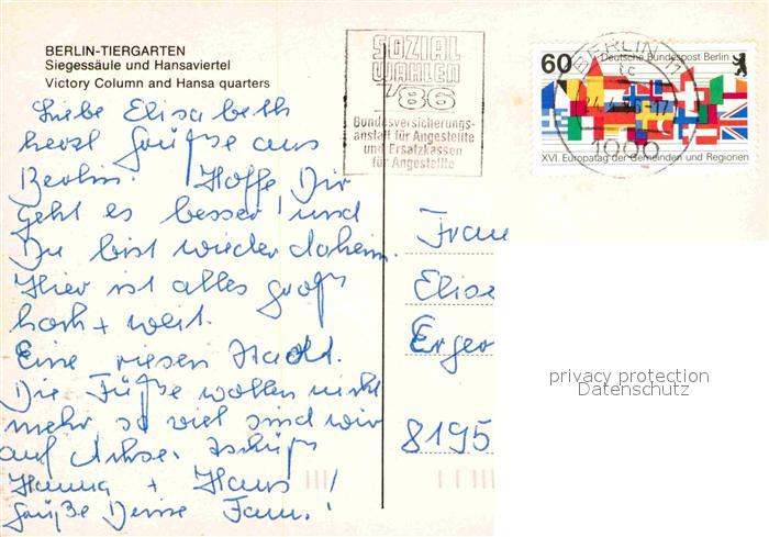72767152 alte Postkarte Tiergarten Berlin Siegessaeule und Hansaviertel postalisch gelaufen Erhaltung siehe scans [WerneD78] KatCode: 11110011000000