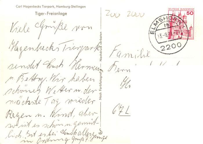 alte Postkarte Tiger Tigre– Freianlage CarlHagenbecks Tierpark Hamburg-Stellingen postalisch gelaufen Erhaltung siehe scans [IrynaD87]