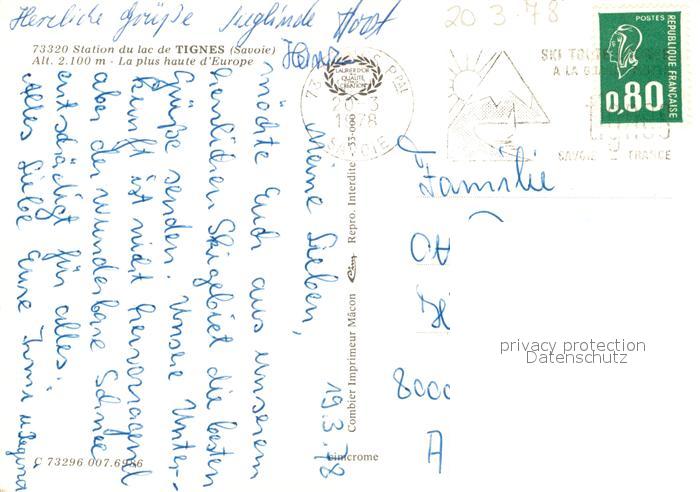 13143825 carte postale Tignes Station d hiver du lac de Tignes Wintersportplatz Alpen postalisch gelaufen Erhaltung siehe scans [FriedD77] KatCode: 11170073173296