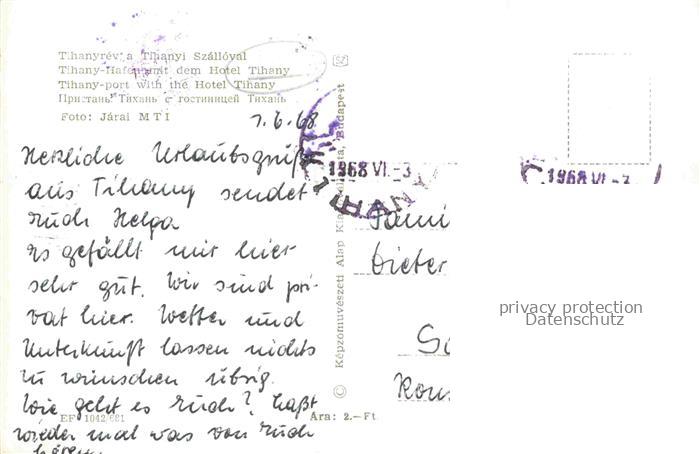 74156352 old postcard Tihany HU Hotel-Tihany Hafen Plattensee Segelboote Hochhaus Luftaufnahme Parkplatz Balaton postalisch gelaufen Fliegeraufnahme Erhaltung siehe scans [Karloger] KatCode: 11550