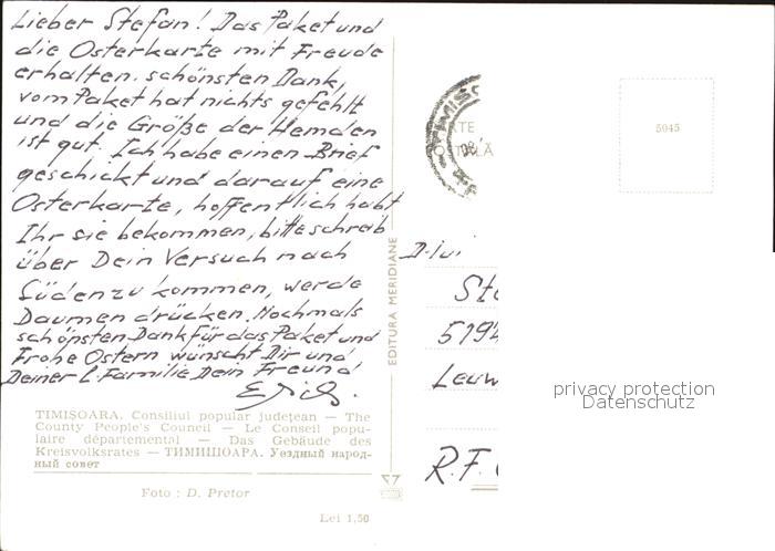 old postcard Timisoara Gebaeude des Kreisvolksrates postalisch gelaufen Erhaltung siehe scans [AntonD74]