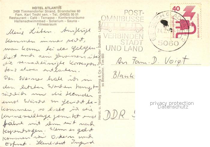 73054891 alte Postkarte Timmendorfer Strand Hotel Atlantis mit Schifferklause postalisch gelaufen Erhaltung siehe scans [WerneD78] KatCode: 11110001055042
