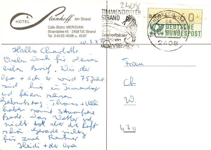 73940366 Timmendorfer Strand Timmendorferstrand Timmendorf Hotel Steinhoff Am Strand Gastraeume postalisch gelaufen Erhaltung siehe scans [FriedD77] alte Postkarte Frie Katcode 11110001055042