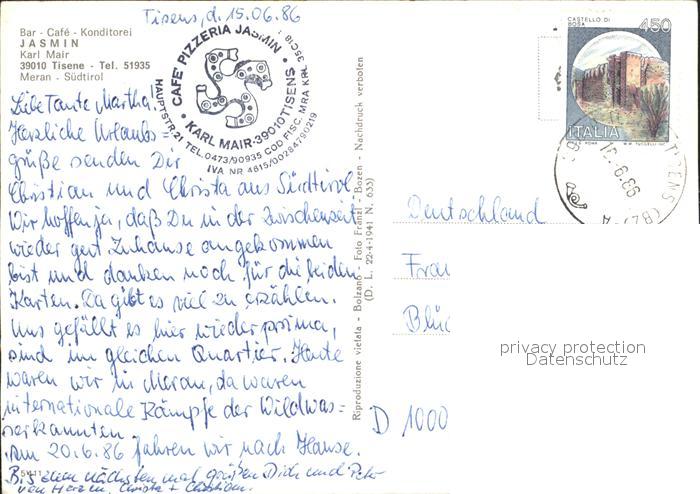 old postcard Tisens Merano Suedtirol Cafe Bar Jasmin postalisch gelaufen Erhaltung siehe scans