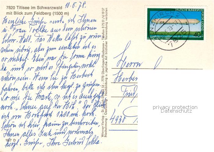 73599991 alte Postkarte Titisee mit Blick zum Feldberg Fliegeraufnahme postalisch gelaufen Erhaltung siehe scans [FriedD77] KatCode: 11110008315113