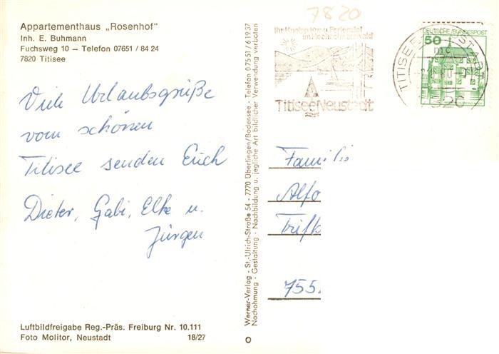 73929171 alte Postkarte Titisee-Neustadt Appartementhaus Rosenhof Fliegeraufnahme postalisch gelaufen Erhaltung siehe scans [WerneD78] KatCode: 11110008315113