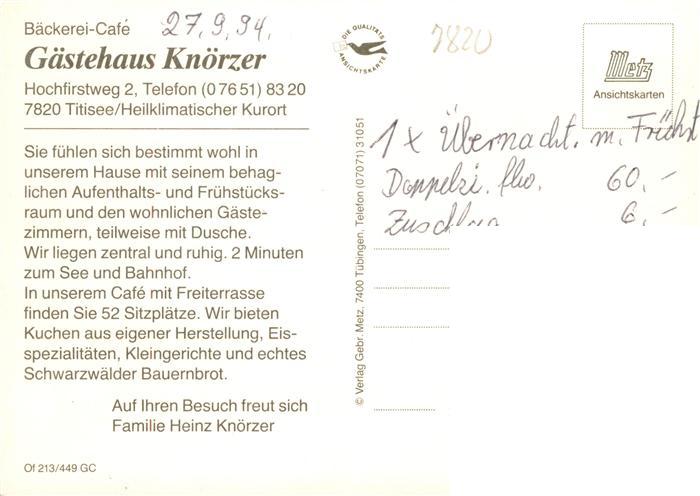 73928884 Titisee-Neustadt Baeckerei Cafe Gaestehaus Knoerzer Gastraeume postalisch nicht gelaufen Erhaltung siehe scans [WerneD78] KatCode: 11110008315113