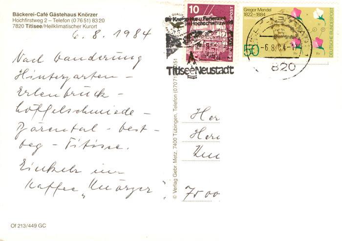 73929423 alte Postkarte Titisee-Neustadt Baeckerei Cafe Gaestehaus Knoerzer Gastraeume postalisch gelaufen Erhaltung siehe scans [WerneD78] KatCode: 11110008315113