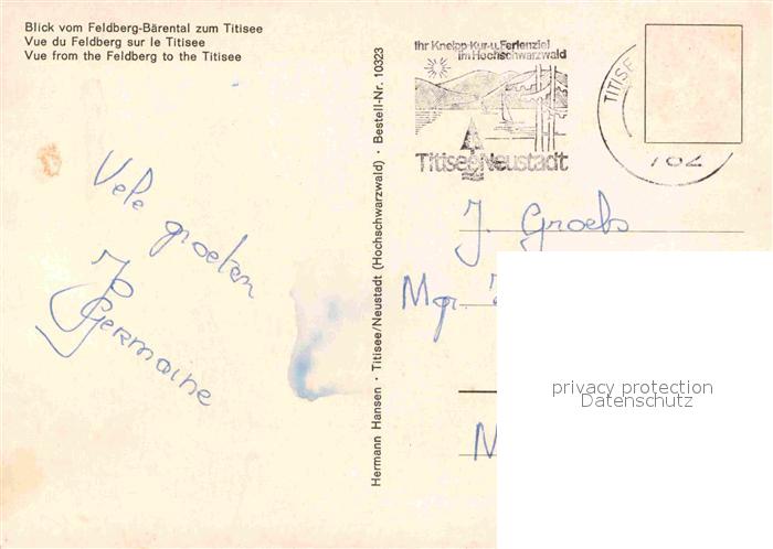72865089 alte Postkarte Titisee-Neustadt Blick vom Feldberg-Baerental postalisch gelaufen Erhaltung siehe scans [LiesaD40] KatCode: 11110008315113