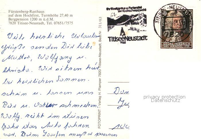 73162055 alte Postkarte Titisee-Neustadt Fuerstenberg Rasthaus postalisch gelaufen Erhaltung siehe scans [KathaD81] KatCode: 11110008315113