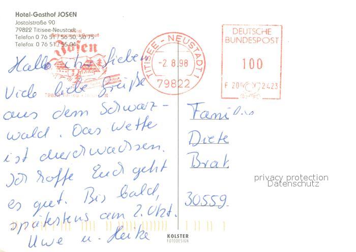 73637774 alte Postkarte Titisee-Neustadt Hotel Gasthof Josen Restaurant Hallenbad postalisch gelaufen Erhaltung siehe scans [FriedD77] KatCode: 11110008315113