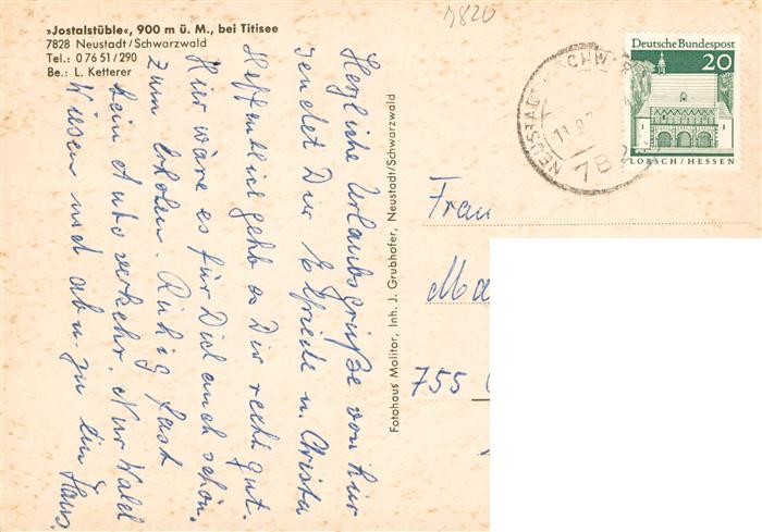 73928862 alte Postkarte Titisee-Neustadt Jostalstueble postalisch gelaufen Erhaltung siehe scans [WerneD78] KatCode: 11110008315113