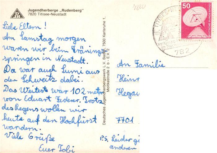 73928877 alte Postkarte Titisee-Neustadt Jugendherberge Rudenberg postalisch gelaufen Erhaltung siehe scans [WerneD78] KatCode: 11110008315113