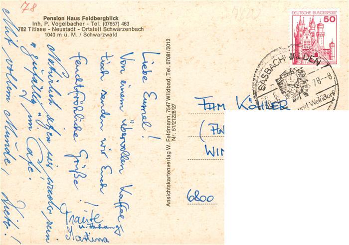 73928778 alte Postkarte Titisee-Neustadt Pension Haus Feldbergblick mit Feldberg postalisch gelaufen Erhaltung siehe scans [WerneD78] KatCode: 11110008315113