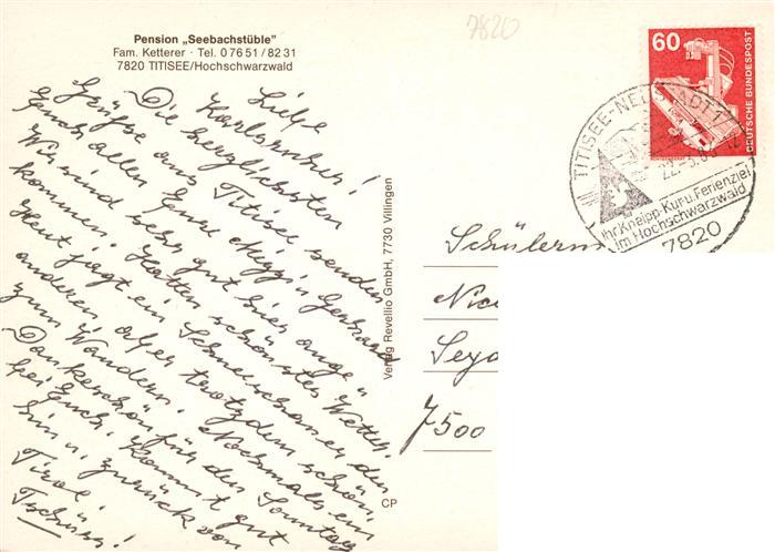 73928800 alte Postkarte Titisee-Neustadt Pension Seebachstueble postalisch gelaufen Erhaltung siehe scans [WerneD78] KatCode: 11110008315113