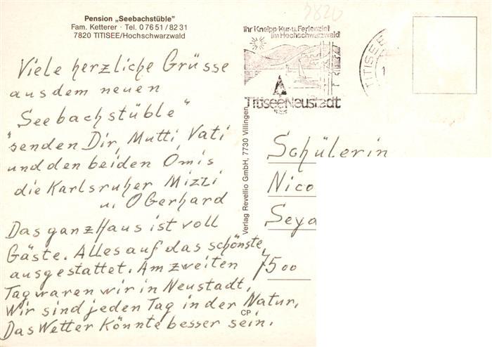 73929040 alte Postkarte Titisee-Neustadt Pension Seebachstueble postalisch gelaufen Erhaltung siehe scans [WerneD78] KatCode: 11110008315113
