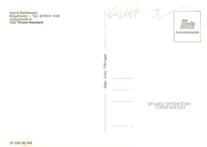 73648678 Titisee-Neustadt Reichmann’s Kegelstube Gaststaette Kegelbahnen postalisch nicht gelaufen Erhaltung siehe scans [FriedD77] KatCode: 11110008315113