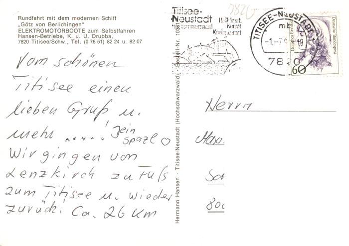 73928907 alte Postkarte Titisee-Neustadt Rundfahrt mit Elektromotorboot Goetz von Berlichingen Anlegesteg postalisch gelaufen Erhaltung siehe scans [WerneD78] KatCode: 11110008315113