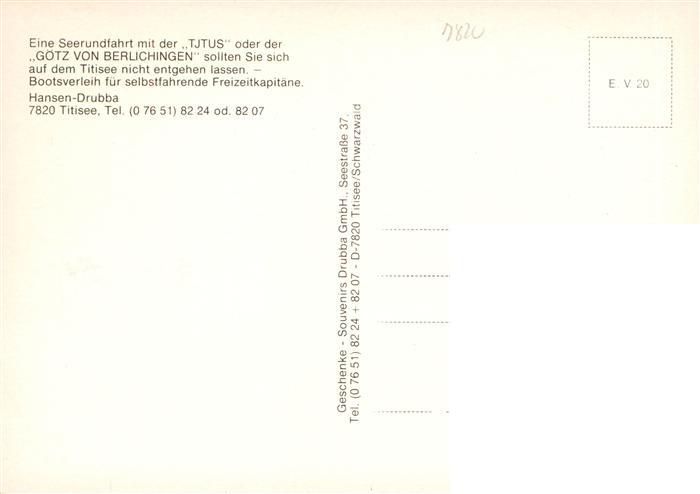 73929496 Titisee-Neustadt Seerundfahrt mit der Titus oder der Goetz von Berlichingen auf dem Titisee postalisch nicht gelaufen Erhaltung siehe scans [WerneD78] KatCode: 11110008315113