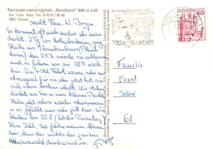 73885342 TITISEE Schwarzwald BW Campingplatz Sandbank Gastraum Fliegeraufnahme Seepartie postalisch gelaufen Erhaltung siehe scans [WerneD78] alte Postkarte Wern Katcode 11110008315113