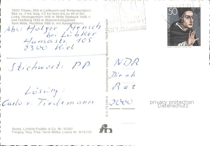 71831931 alte Postkarte TITISEE Schwarzwald BW Fliegeraufnahme Herzogenhorn Seebuck Feldberg Hochfrist Aussichtsturm postalisch gelaufen Erhaltung siehe scans KatCode: 11110008315113