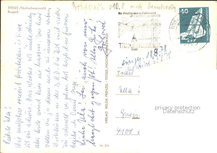 72529218 alte Postkarte TITISEE Schwarzwald BW Kurpark postalisch gelaufen Erhaltung siehe scans KatCode: 11110008315113