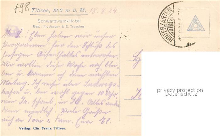 73576107 alte Postkarte Titisee Schwarzwald Hotel postalisch gelaufen Erhaltung siehe scans [WerneD78] KatCode: 11110008315113