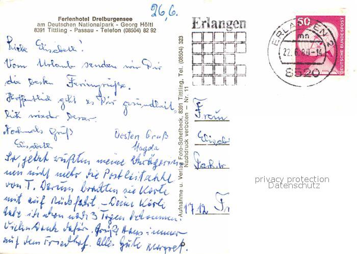 72826437 alte Postkarte Tittling Ferienhotel Dreiburgensee Deutscher Nationalpark postalisch gelaufen Erhaltung siehe scans [FriedD77] KatCode: 11110009275152