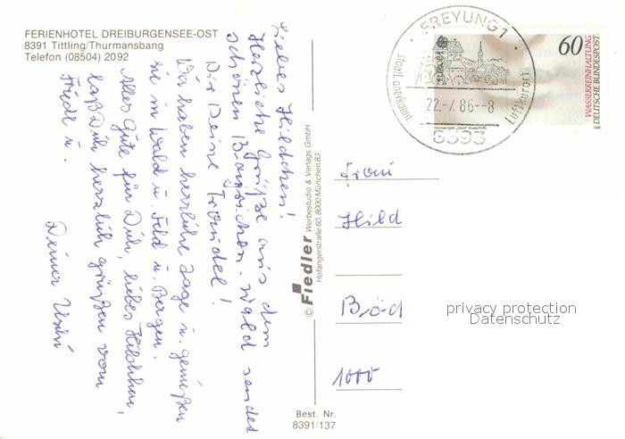 72853820 alte Postkarte Tittling Ferienhotel Dreiburgensee-Ost postalisch gelaufen Erhaltung siehe scans [NatalD47] KatCode: 11110009275152