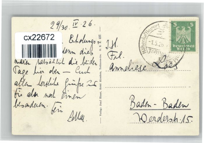 30751404 alte Postkarte Todtmoos Hotel Pension Hirschen postalisch gelaufen KatCode: 11110008337108